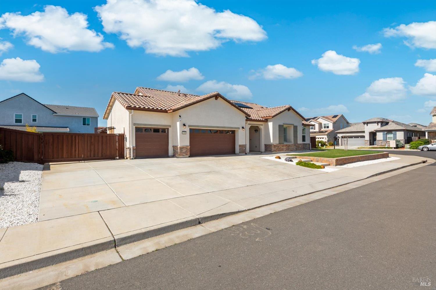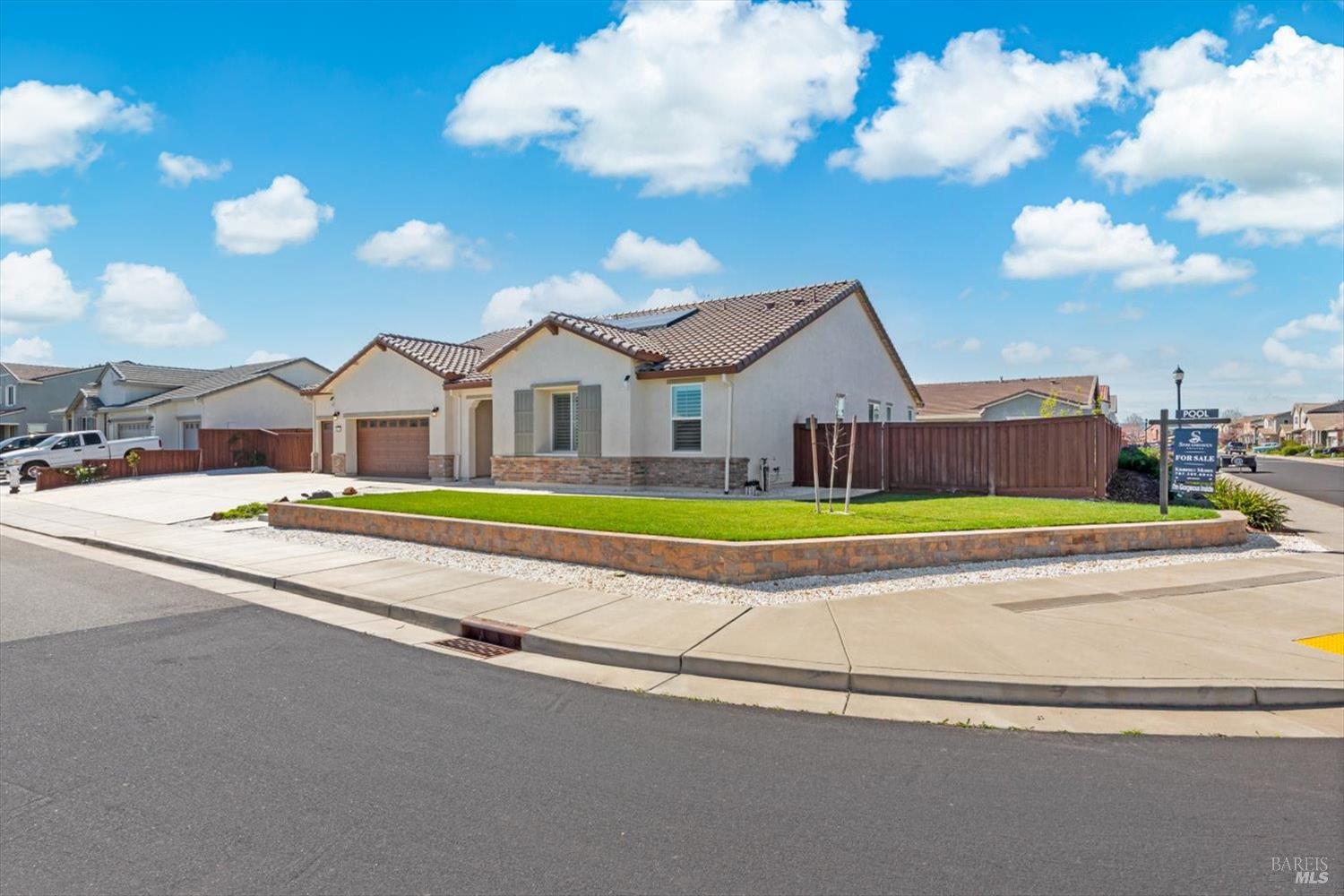 Rare opportunity to own this meticulously maintained single-story Melody floor plan built in 2022, featuring owned solar with backup batteries, a 3-car garage, and extended RV parking, all ideally situated on a desirable corner lot in Dixon. This move-in ready 3-bedroom, 2-bath home offers thoughtful upgrades and beautifully designed indoor-outdoor living. The open-concept kitchen, dining, and living space features vaulted ceilings and expansive windows that fill the home with natural light, complemented by plantation shutters throughout. The chef's kitchen showcases designer finishes including an extended island with custom wainscoting, quartz countertops, extended cabinetry with upgraded 15 inch deep upper cabinets, a striking matte black apron-front sink with stylish faucet, a 5-burner cooktop, and a beautiful herringbone tile backsplash. A huge walk-in pantry provides exceptional storage and convenience. Luxury vinyl plank flooring runs throughout the main living areas, enhancing both style and durability. The spacious primary suite offers brand-new carpet and a comfortable retreat, while the spa-inspired bathroom features a large soaking tub, an expansive walk-in shower with marble surround, and an impressive walk-in closet designed for everyday luxury. Two additional bedrooms are located along the front hallway, including one with a Murphy bed ideal for flexible guest or office space. The 3-car garage features epoxy floors, built-in cabinetry, and ceiling storage racks. Step outside to a backyard designed for both relaxing and entertaining with a beautiful pool and spa with Cabo shelf, a large patio cover with pull-down shades, misters, and fans for year-round comfort. A separate lawn area with young trees adds greenery and space to enjoy. Additional features include a water softener system. A rare combination of modern comfort, thoughtful upgrades, and resort-style outdoor living.