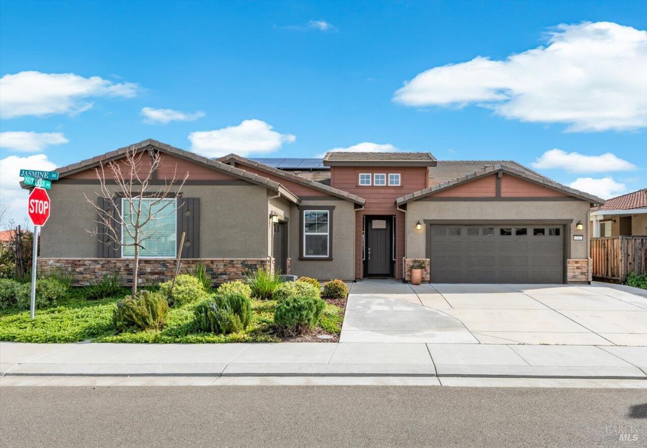 Better than new and loaded with upgrades welcome to 745 Jasmine Street in Dixon! Built in 2022 and offering over 2,900 square feet, this spacious single-story, 4-bedroom, 3-bath home delivers modern design, flexible living, and an entertainer's dream kitchen. The open-concept layout is perfect for both everyday living and hosting. The chef's kitchen features abundant cabinetry and storage, an oversized island that comfortably seats six, and a walk-in pantry with prep sink for added functionality and organization. It flows seamlessly into the great room, creating the ideal gathering space. The primary suite is a true retreat, complete with separate vanities, a luxurious soaking tub, a large walk-in shower, and an expansive walk-in closet. A Jack and Jill bathroom with separate sinks connects two secondary bedrooms, while a secluded fourth bedroom with its own nearby full bath offers ideal privacy for guests or multigenerational living. Additional highlights include solar, a Puronix water softener system, a rare 2-car garage plus separate 1-car garage, and a fully landscaped backyard featuring a built-in fountain just in time for summer enjoyment. Located in a desirable neighborhood close to parks and just minutes from I-80, this home combines comfort, convenience, and style. Don't miss your opportunity to own one of Dixon's most impressive newer homes schedule your private showing today.